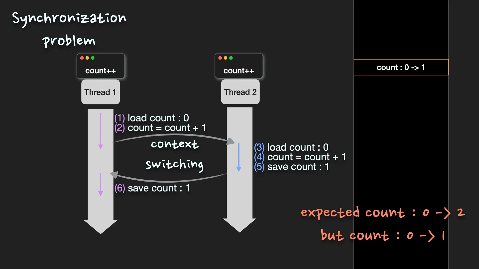 동기화 문제란 서로 다른 thread가 메모리 영역을 공유하기 때문에 여러 thread가 동일한 자원에 동시에 접근하여 엉뚱한 값을 읽거나 수정하는 문제입니다.