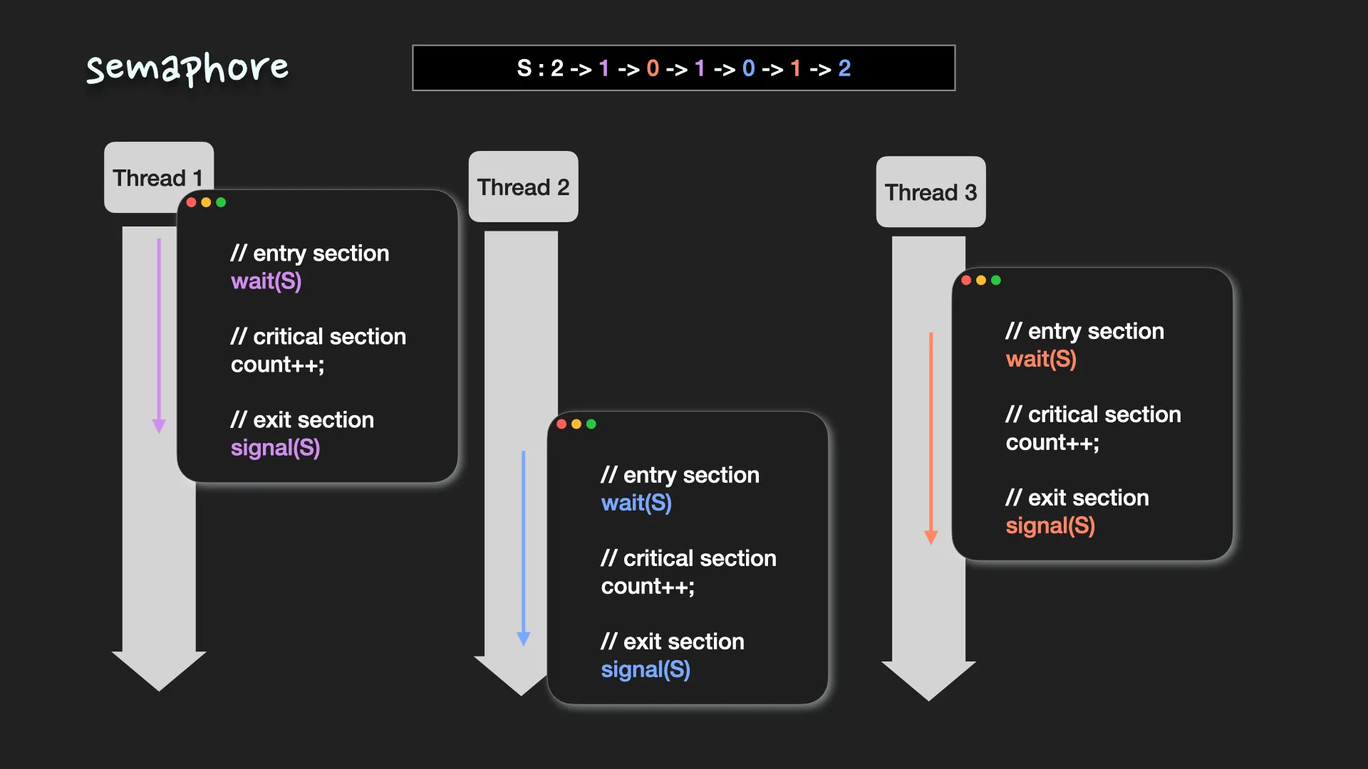 semaphore 변수 S(세마포)에 동시에 접근 가능한 process/thread의 갯수를 저장합니다. S가 0보다 크면 임계영역으로 들어갈 수 있고, 임계영역에 들어가면 S값을 1 감소시킵니다. S값이 0이 되면 다른 process/thread는 임계영역으로 접근할 수 없습니다. 임계영역에서의 작업이 끝나고 임계영역에서 exit하면서 S값을 1 증가시킵니다.