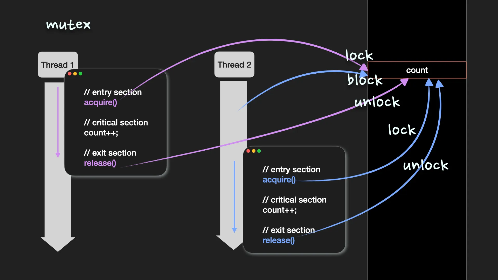 Mutex란 1개의 스레드만이 공유 자원에 접근할 수 있도록 하여, 경쟁 상황(race condition)를 방지하는 기법입니다. 공유 자원을 점유하는 thread가 lock을 걸면, 다른 thread는 unlock 상태가 될 때까지 해당 자원에 접근할 수 없습니다.