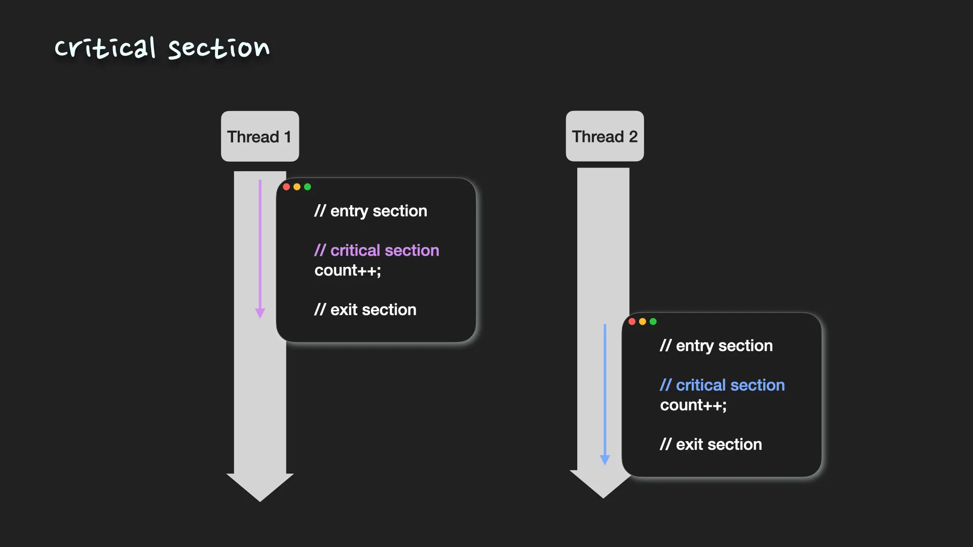 원자적으로 실행 되기 위해서 각각의 process/thread는 자신의 임계구역으로 진입하려면 진입 허가를 요청해야합니다. 이 부분을 entry section이라고 하고, 진입이 허가되면 임계영역을 실행할 수 있습니다. 임계영역이 끝나고 나면 exit section으로 퇴출을 하게 됩니다. 임계영역의 원자성을 보장하여 process/thread들이 동기화되도록 할 수 있습니다.