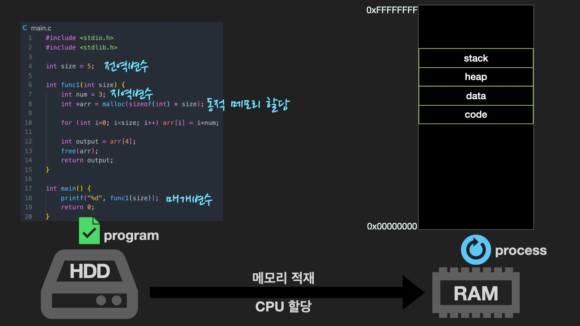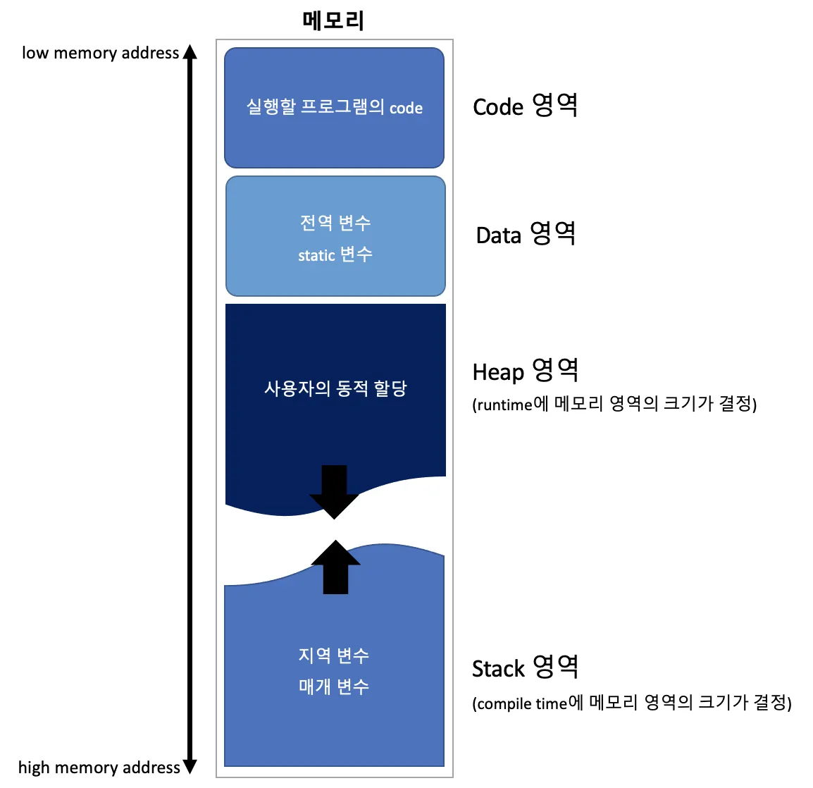Heap 영역 | 프로그래머가 직접 공간을 할당(malloc)/해제(free) 하는 메모리 영역 |