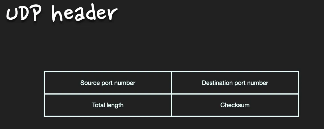 UDP는 비연결형 프로토콜로 3-way handshake 등의 세션 수립 과정이 없습니다. 또한 비신뢰성 프로토콜로 흐름제어, 오류제어, 혼잡 제어를 제공하지 않습니다. 이러한 단순성 덕분에 적은 양의 오버헤드갖고 수신여부를 확인하지 않아서 속도가 빠릅니다