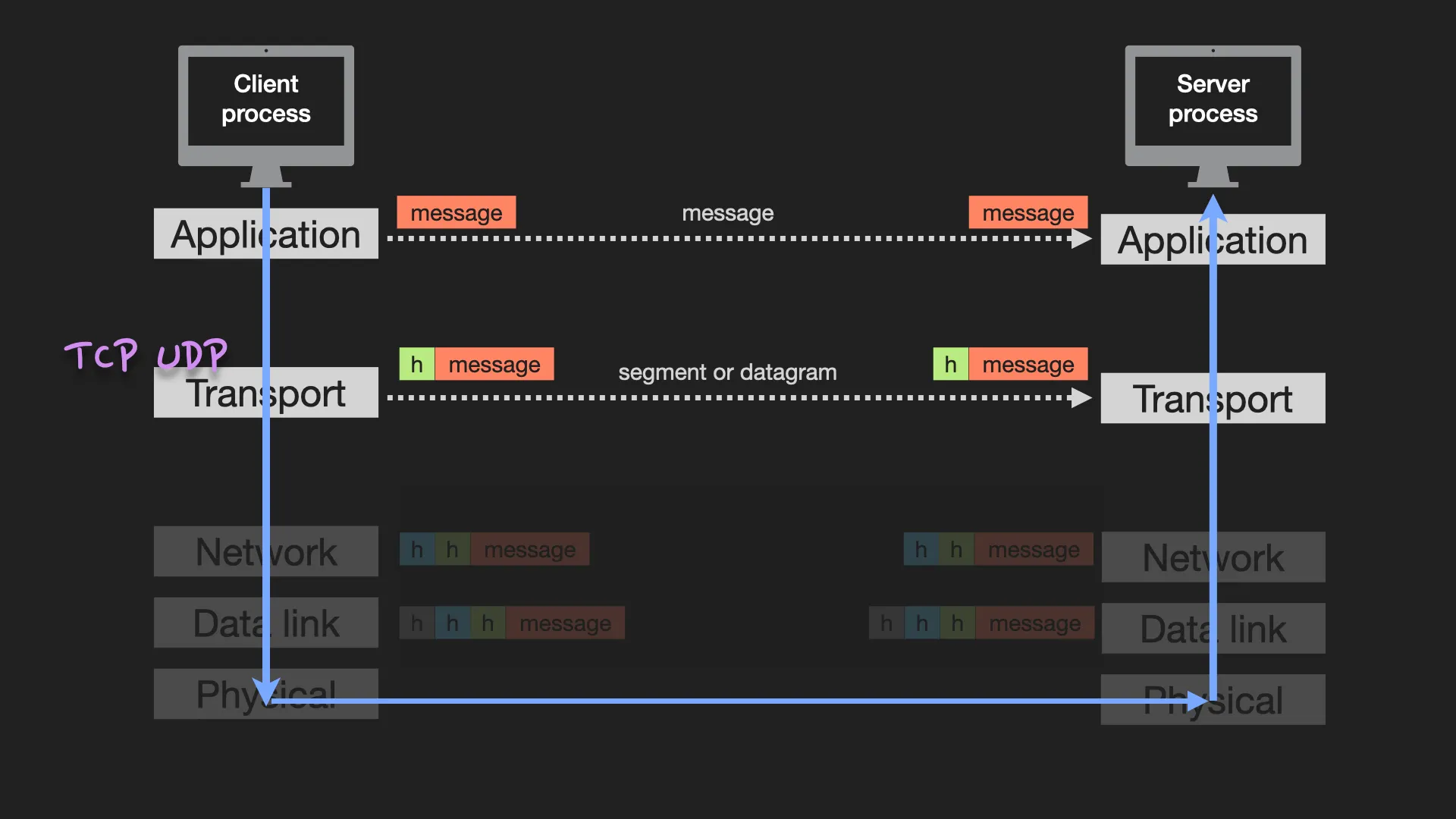 그 중에 전송계층은 두 응용 계층 사이에서의 process-to-process 통신을 제공합니다. 전송계층은 응용계층으로부터 메시지를 받아 전송계층 패킷으로 캡슐화하여 전송합니다.(segment 또는 datagram으로 부릅니다.)