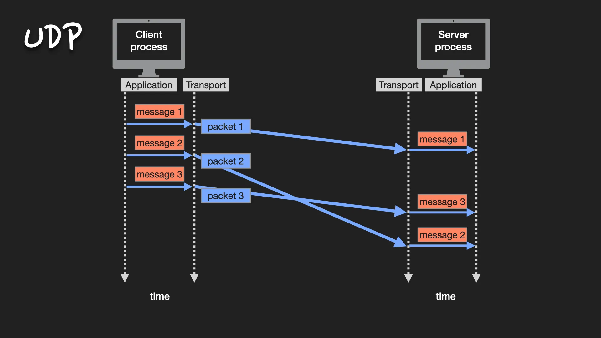 ex) live방송과 같이 실시간 상호작용을 하는 응용프로그램을 사용한다고 가정해 봅시다. 음성과 영상을 한프레임씩 전송을 합니다. 전송계층에서 훼손되거나 손실된 프레임을 재전송 해야된다면 전체적으로 지연이 될겁니다. 따라서 UDP를 통해서 한프레임씩 datagram으로 전송한다면 훼손되거나 손실된 패킷은 그냥 무시하고 나머지 패킷을 응용프로그램으로 전달한다. 손실된 패킷으로 인해 짧은 시간동안 화면의 일부분이 공백으로 표시되더라도 대부분의 시청자들은 인식하지 못합니다. 이 때는 신뢰성보다 실시간성이 더 중요하기때문에 UDP를 사용합니다.
