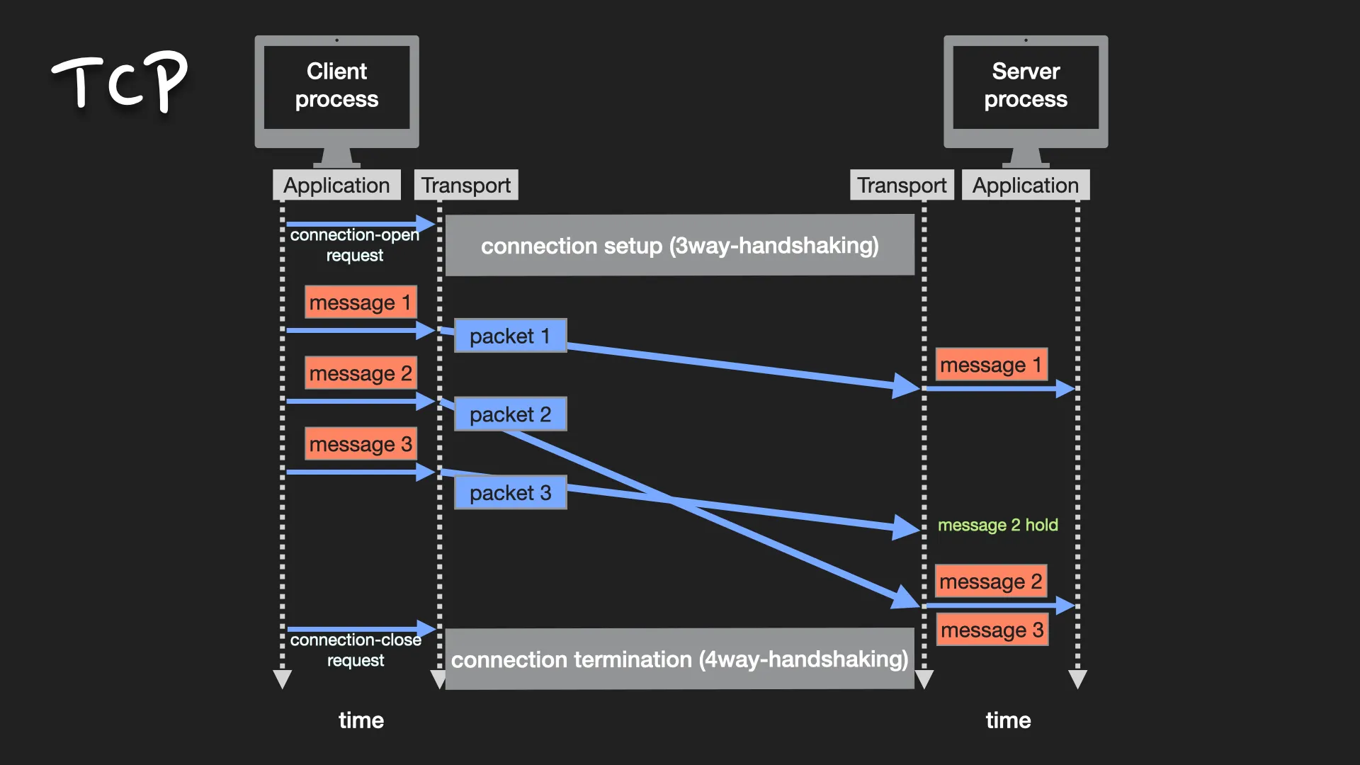 연결지향적 서비스를 제공하기 위해 데이터를 전송하기 전에 먼저 두 호스트의 전송 계층 사이에 논리적 연결을 설립합니다. 그 후 데이터 전송을 하고 데이터 전송을 완료했으면 연결을 해제합니다. TCP의 통신은 이렇게 connection setup, data transfer, connection termination의 세 단계로 나뉩니다.