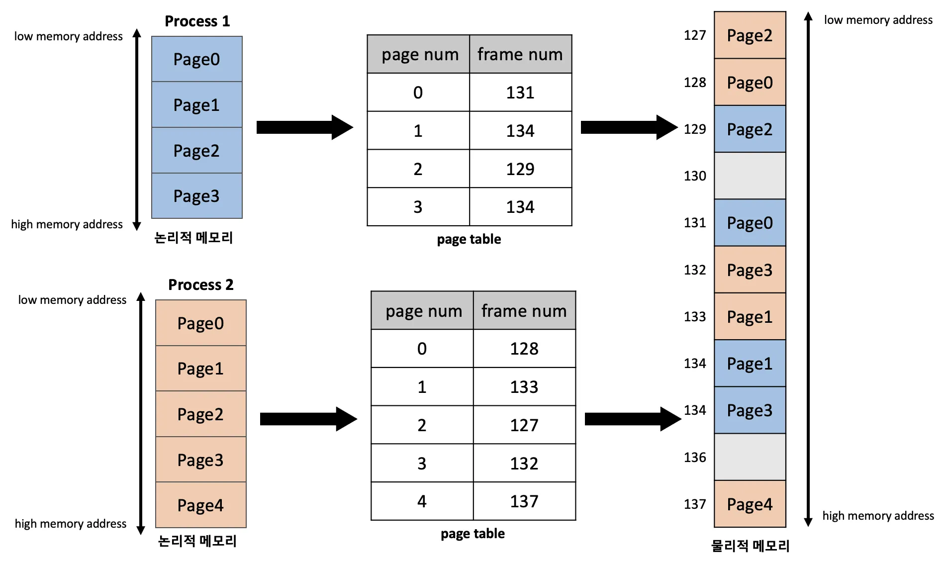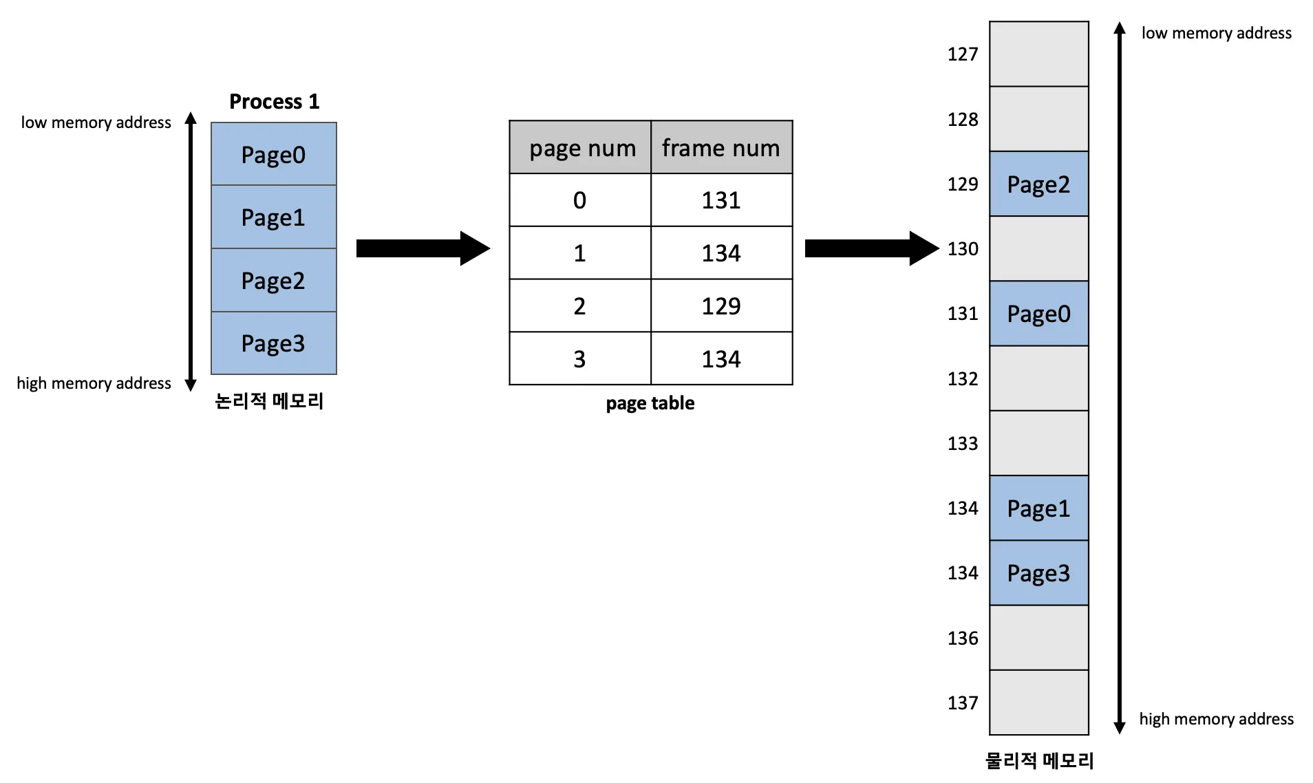 특히 논리적주소와 물리적주소의 차이를 이해해야하고, 물리 메모리의 연속되지 않는 서로 다른 위치에 page단위만큼 저장한다는 점을 설명할 수 있어야 합니다.