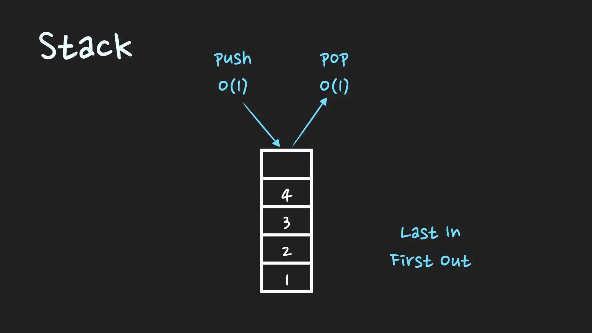 stack에서 데이터를 추가하는 것을 push라고 하고 데이터를 추출 하는 것은 pop이라고 합니다. push의 경우 stack의 맨 뒤에 데이터를 추가하면 완료되기 때문에 시간복잡도는 O(1)입니다. 이와 동일하게 pop의 경우도 맨 뒤의 데이터를 삭제하면 완료 되기 때문에 O(1)의 시간복잡도를 갖습니다. push와 pop은 모두 stack의 top에 원소를 추가하거나 삭제하는 형식으로 구현됩니다.