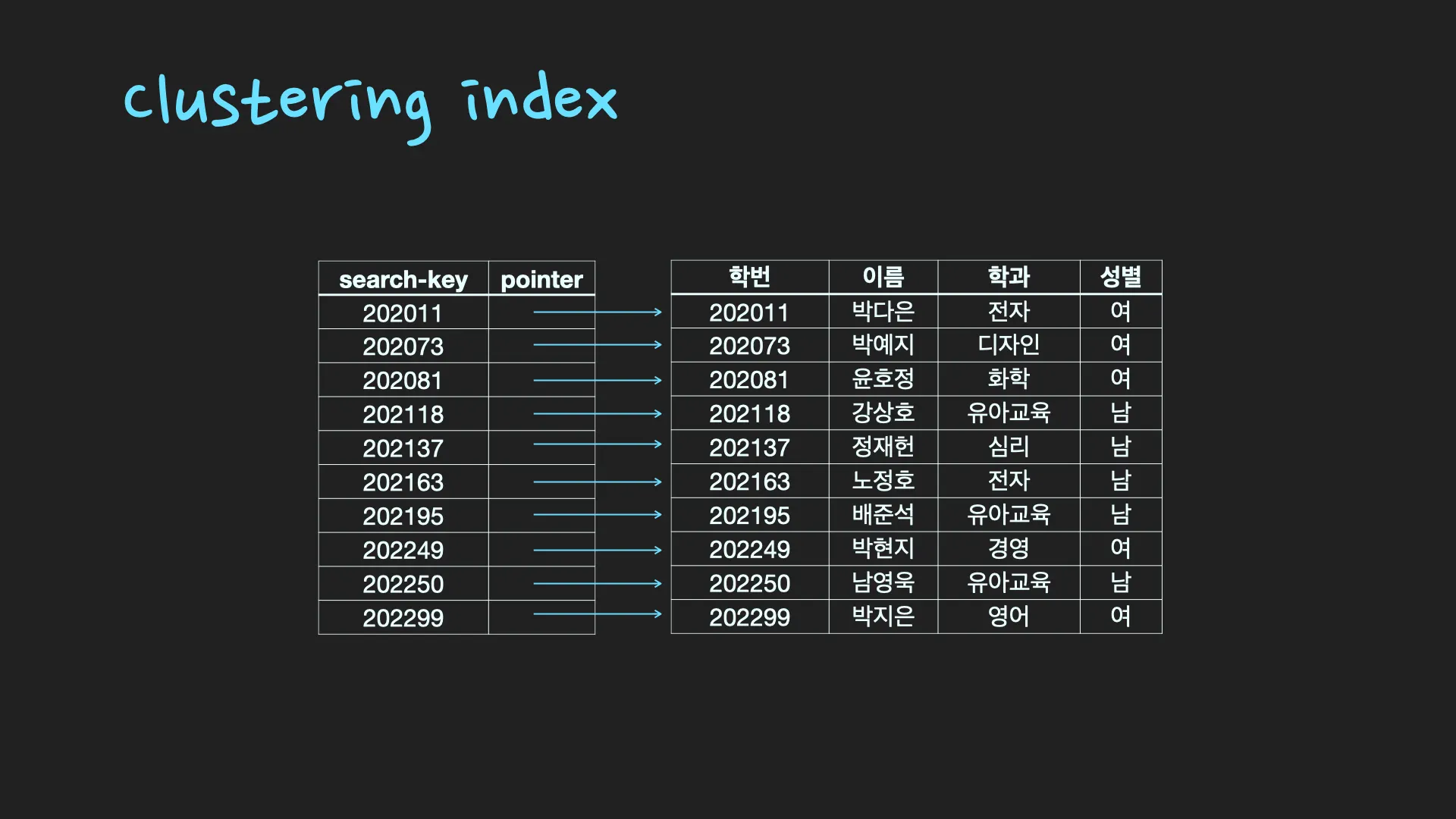 정리해보면 특정 column을 search-key 값으로 설정하여 index를 생성하면, 해당 search-key 값을 기준으로 정렬하여 (search-key, pointer)를 별도 파일에 저장합니다. 이를 index라고 합니다.