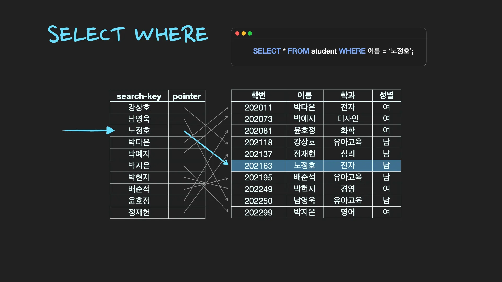 Table에 데이터를 지속적으로 저장하게 되면 내부적으로 순서 없이 쌓이게 됩니다. 이 경우에 특정 조건을 만족하는 데이터를 찾고자 WHERE절을 사용한다면 Table의 row(record)를 처음부터 끝까지 모두 접근하여 검색조건과 일치하는지 비교하는 과정이 필요합니다. 이를 Full Table Scan이라고 합니다. 하지만 특정 coloumn에 대한 Index를 생성해 놓은 경우 해당 속성에 대하여 search-key가 정렬되어 저장되어 있기 때문에 조건 검색(SELECT ~ WHERE) 속도가 굉장히 빠릅니다.