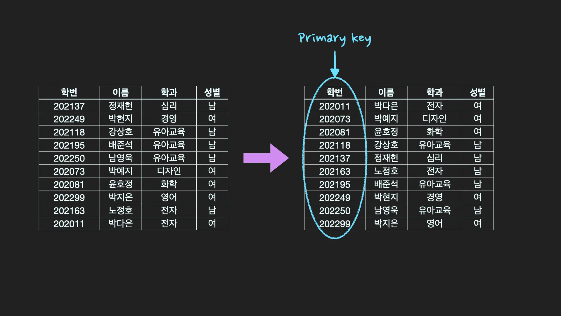 SELECT ~WHERE query를 통해 특정 조건을 만족하는 데이터를 찾을 때, full table scan할 필요 없이 정렬되어 있는 index에서 훨씬 빠른 속도로 검색을 할 수 있게 됩니다.